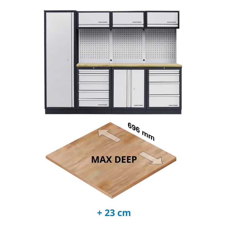 Mobilier d’atelier modulaire pour un assemblage personnalisable en fonction des besoins. Conception autoportante, ne nécessitant ni attaches ni murs de soutien, une installation facile et flexible. Chaque module peut être commandé individuellement. Tiroirs sur roulement à billes avec différentes hauteurs, adaptées à tous les inserts d’outils Kraftwerk (COMPLETO ABS, EVA, EVA3) avec verrouillage centralisé et individuel. Parois porte-outils perforées Euro standard. Plans de travail Multiplex de 35 mm en hêtre d’excellente qualité, usinés en Allemagne et protégés par un vernis d’huile de lin.