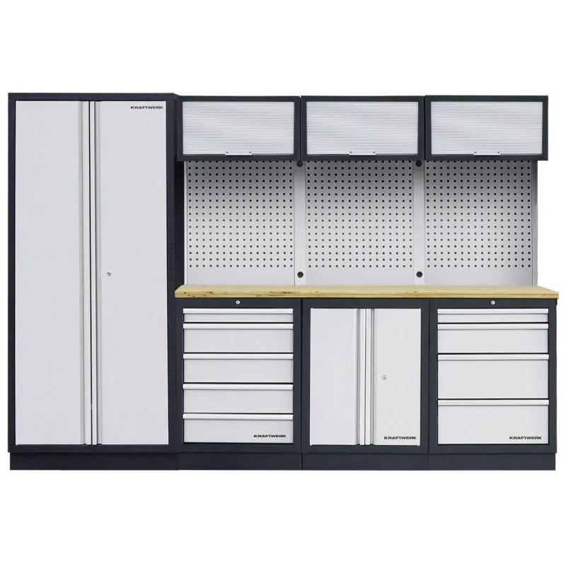 Mobilier d’atelier modulaire pour un assemblage personnalisable en fonction des besoins. Conception autoportante, ne nécessitant ni attaches ni murs de soutien, une installation facile et flexible. Chaque module peut être commandé individuellement. Tiroirs sur roulement à billes avec différentes hauteurs, adaptées à tous les inserts d’outils KRAFTWERK (COMPLETO ABS, EVA, EVA3) avec verrouillage centralisé et individuel. Parois porte-outils perforées Euro standard.Plans de travail Multiplex de 35 mm en hêtre d’excellente qualité, usinés en Allemagne et protégés par un vernis d’huile de lin ou plan de travail inox 38 mm