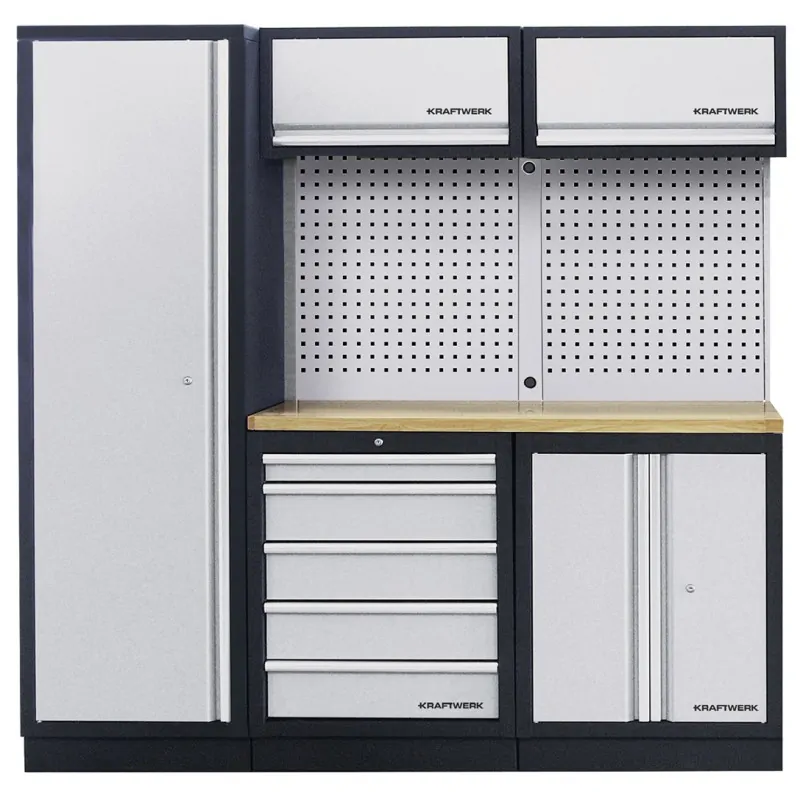 Mobilier d’atelier modulaire pour un assemblage personnalisable en fonction des besoins. Conception autoportante, ne nécessitant ni attaches ni murs de soutien, une installation facile et flexible. Chaque module peut être commandé individuellement. Tiroirs sur roulement à billes avec différentes hauteurs, adaptées à tous les inserts d’outils KRAFTWERK (COMPLETO ABS, EVA, EVA3) avec verrouillage centralisé et individuel. Parois porte-outils perforées Euro standard. Plan de travail Multiplex de 35 mm en hêtre d’excellente qualité, usiné en Allemagne et protégés par un vernis d’huile de lin ou plan de travail inox 38 mm